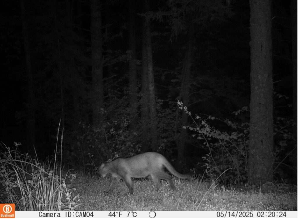 These apex predators thrive in large, connected forested landscapes with thick cover for stalking deer, elk calves, and smaller mammals like raccoons. They often follow ridgelines and even use roads or trails for easier travel. Seeing one on camera is a powerful reminder of the importance of intact habitat corridors between developed areas.