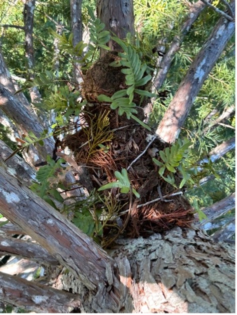 A thriving young fern atop a +/- 180 foot young redwood.
