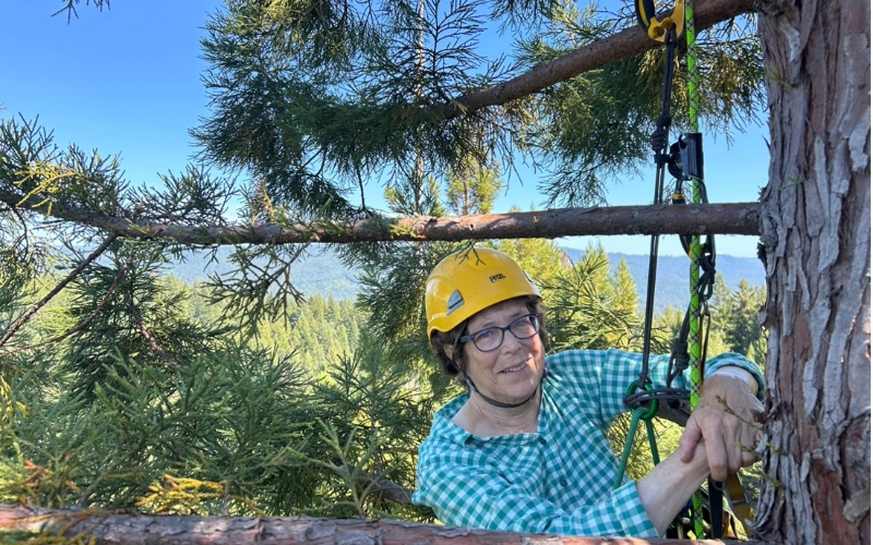 Now, several years in, our work is revealing both promising results and new insights that are shaping our next steps. During a recent field visit, PFT President Laurie Wayburn climbed up to see the fern mats again firsthand—ascending into the canopy to see how they were doing. The large majority of the ferns “planted” across 15 trees have remained intact and continue to support fern growth. The ferns are gradually integrating with their host trees, collecting soil and organic matter, and sporing—releasing these tiny reproductive cells into the rest of the forest to find more places to take hold and grow.